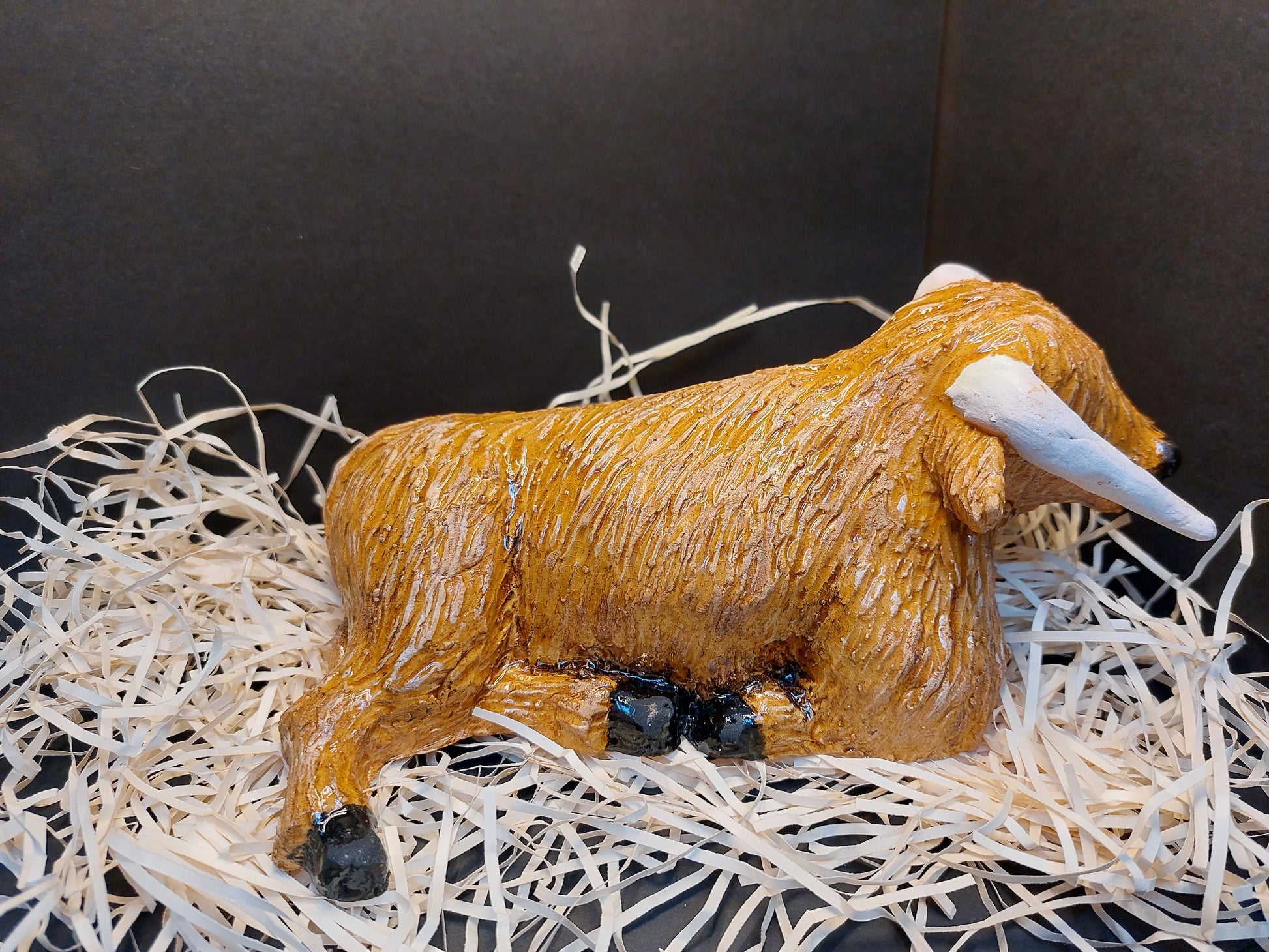 My "Ceramic Highland Cow Sculptures" beautifully capture the distinctive charm of the Highland Cow, portrayed sitting calmly on the floor in a relaxed pose. Each sculpture is handmade with great attention to detail, using either stoneware or terracotta clay to bring out the unique features of this iconic breed, including its long, sweeping horns and shaggy coat. After the sculpting process, the pieces are carefully glazed, enhancing the texture and bringing depth to the natural form of the cow. The result is a timeless and rustic ceramic sculpture that embodies the strength, serenity, and character of the Highland Cow, making each piece a one-of-a-kind addition to any collection.